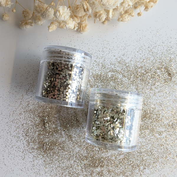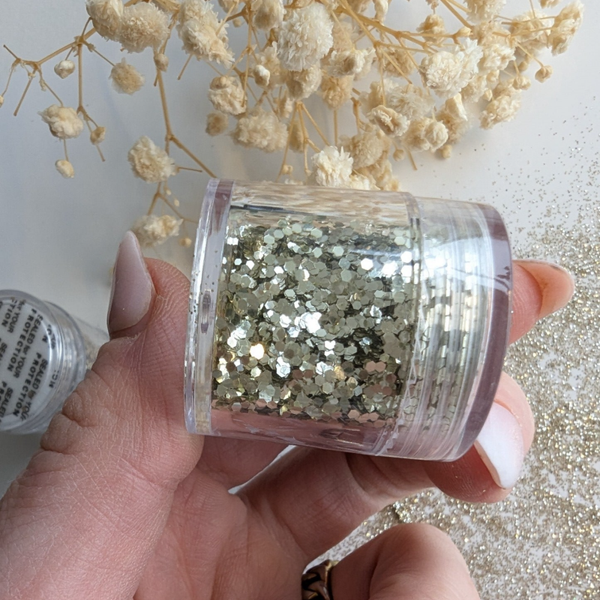 Een bakje met glitters in de vorm van een hexagon