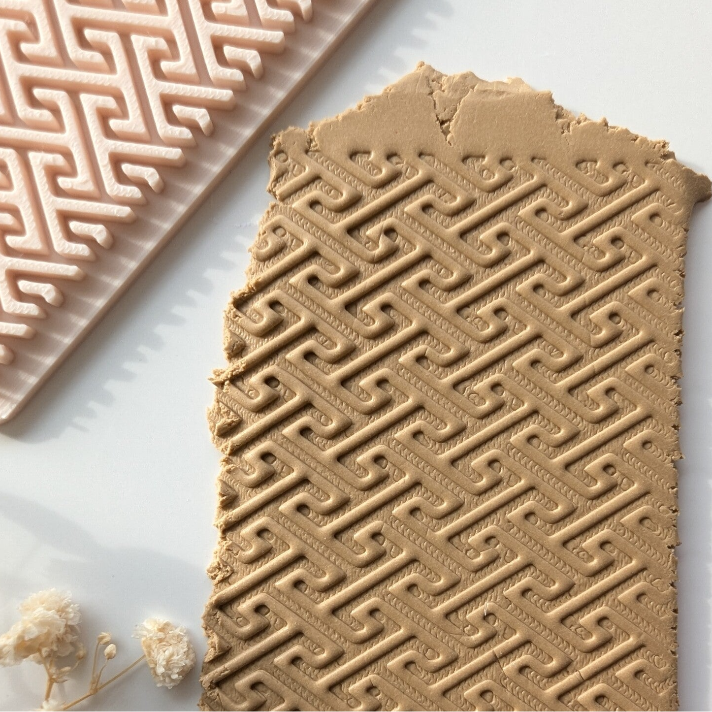 In de klei drukken evt. met de roller gelijkmatig aandrukken en je hebt een prachtige afdruk in de klei.
